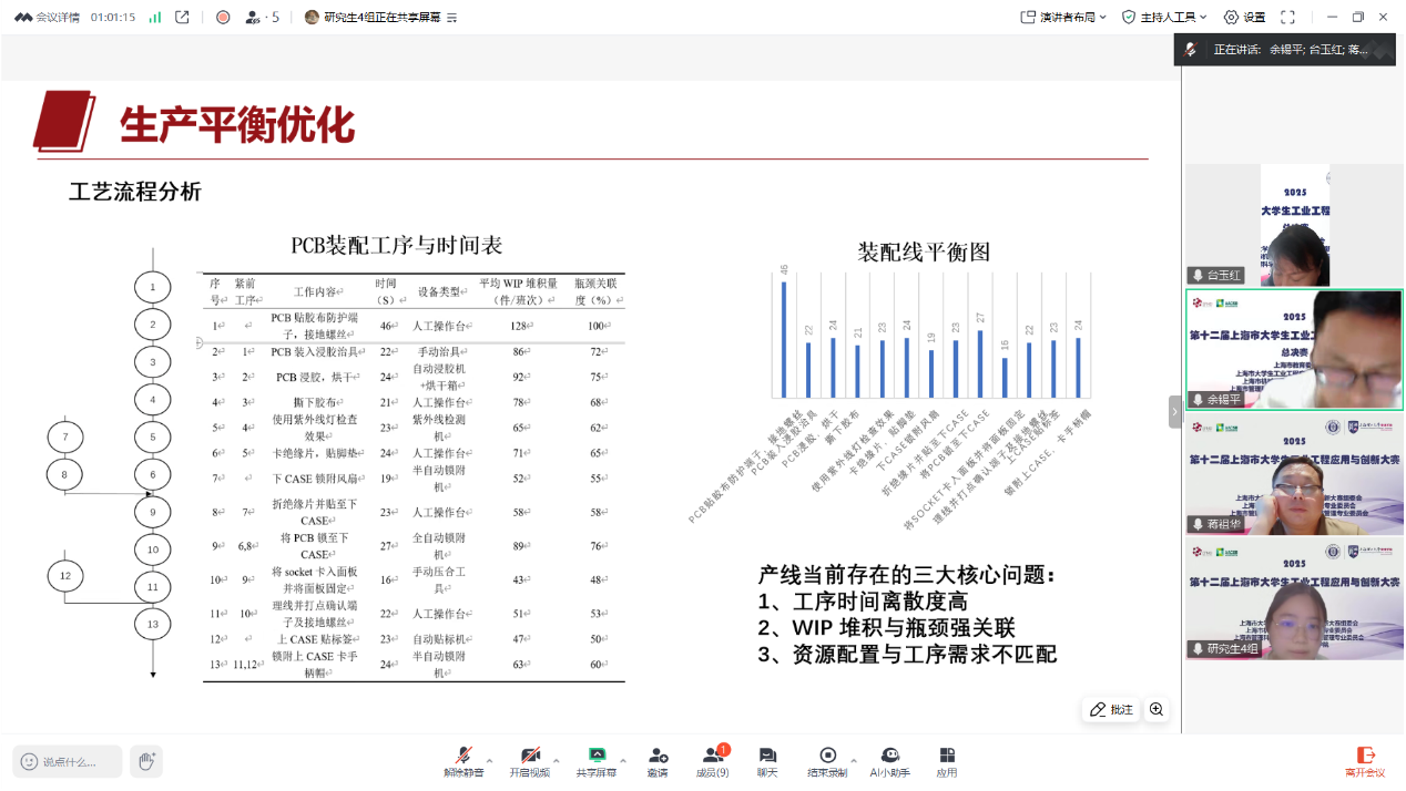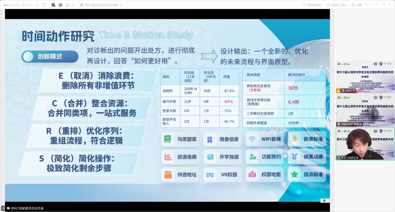 本次总决赛共有24支参赛队伍,其中本科生组16支,研究生组8支。参赛作品涉及工业工程的多个领域,包括精益生产优化、人因工程、AI视觉检测、智慧APP开发等。通过8分钟的汇报与5分钟的答辩,参赛选手充分展示了他们的选题背景、解决方案及所取得的成果,得到了专家评委的肯定,也收获了很多实用的意见和建议。