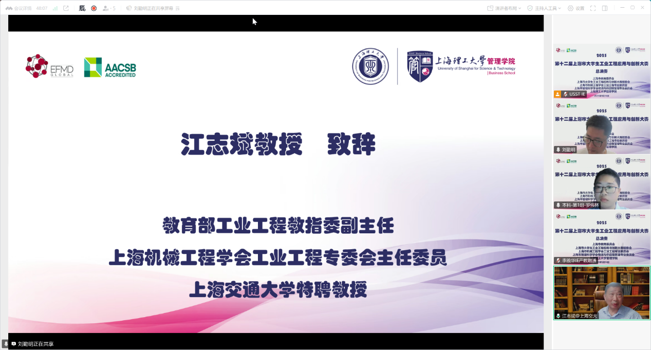 江志斌代表教育部工业工程类专业教指委和上海市机械工程学会工业工程专业委员会,对本次比赛的成功举办表示祝贺,并感谢上海理工大学的精心筹备,期待选拔优秀学生参加国家级竞赛。江志斌认为本次比赛是培养学生创新能力和思维的重要实践,很多参赛题目对接了当前热点和企业需求,具有现实意义。