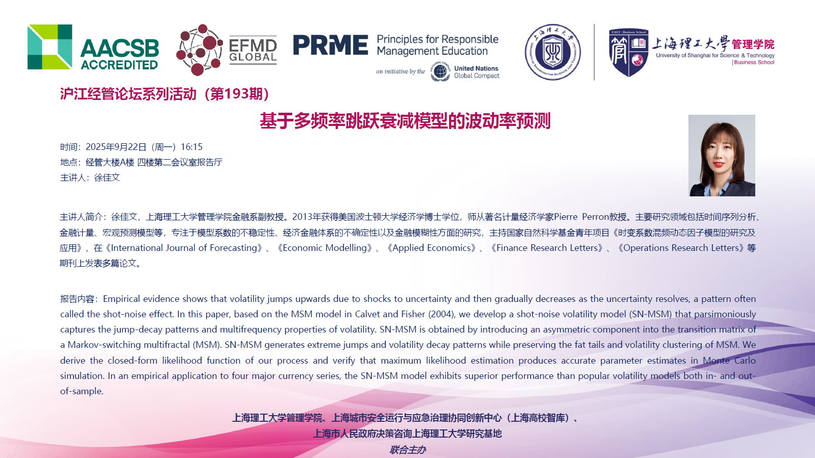 沪江经管论坛系列活动(第193期):基于多频率跳跃衰减模型的波动率预测