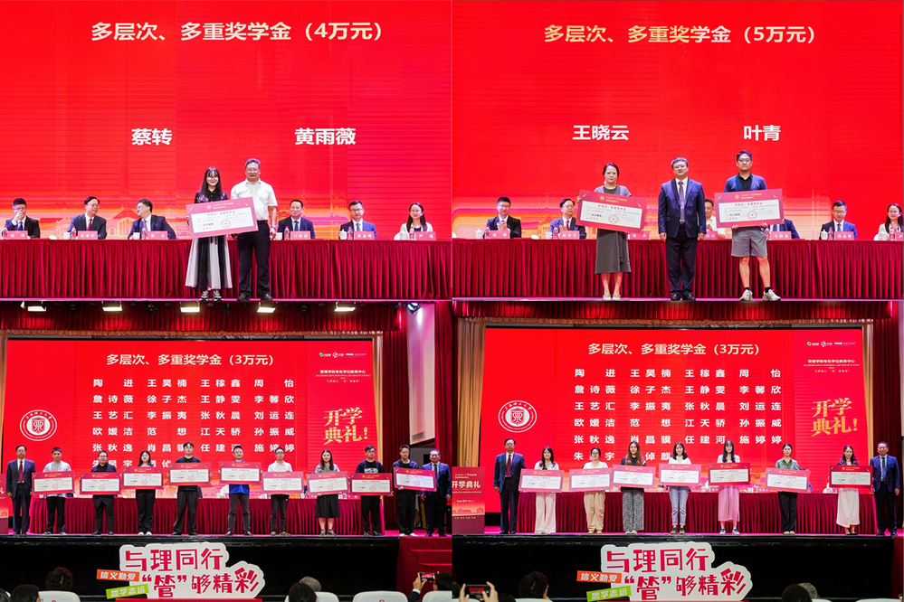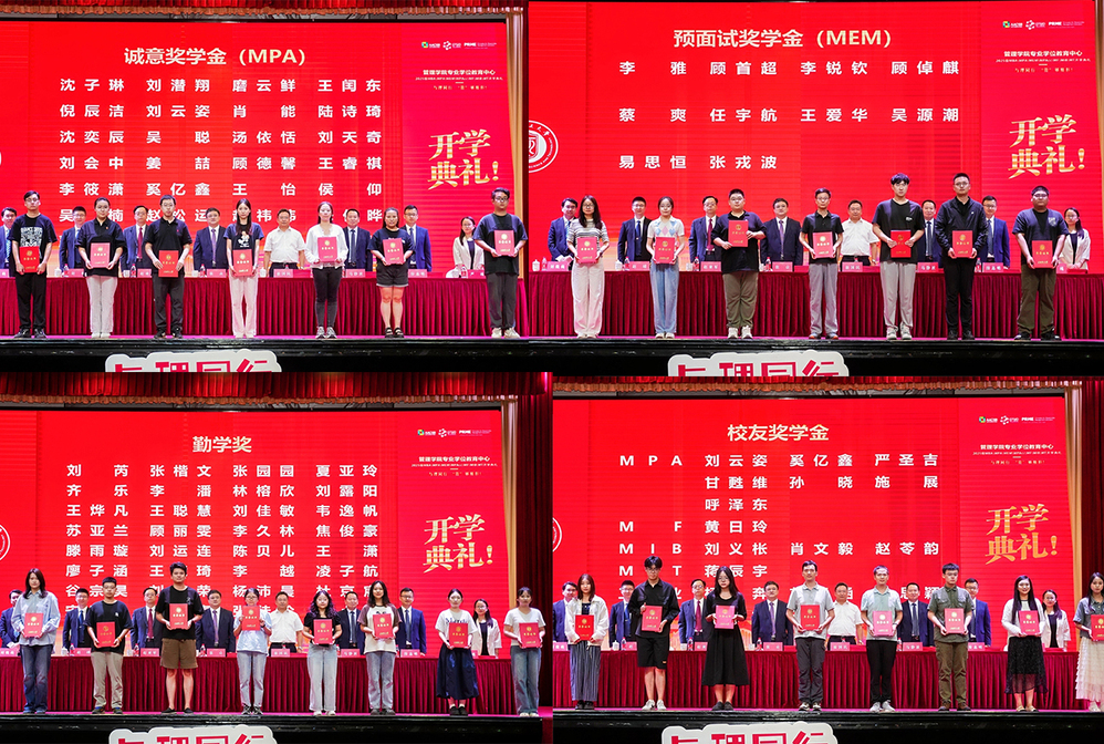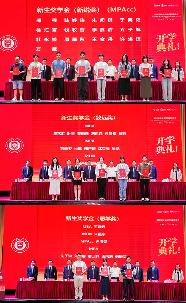 为吸引更多有志于深造的学子选择上理管院专业学位项目,学院构建“多层次、多重”奖学金激励体系,设立“诚意奖学金”“校友奖学金”“新生奖学金”等多个奖项,助力每一位同学安心求学、专注成长。典礼上,马静波宣读了《关于颁发上海理工大学管理学院专业学位教育中心2025年新生奖学金的决定》,随后主席台嘉宾为获奖学生颁奖并合影。此次颁奖既是对优秀学子的肯定,也寄托了学院对大家潜心学业、追求卓越的鼓励与期望。