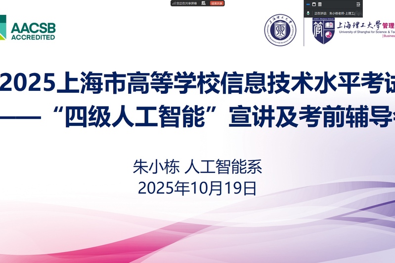 10月19日,为进一步落实信息技术创新人才培养要求,助力学生提升人工智能应用能力与就业竞争力,上海理工大学管理学院举办了“2025年上海市高等学校信息技术水平考试——四级人工智能”宣讲及考前线上辅导会。会议由人工智能系支部书记、上海理工大学电子商务发展研究院副院长朱小栋主持。