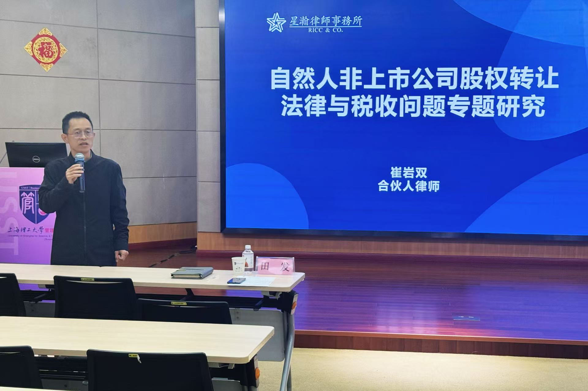 10月23日,上海理工大学管理学院专业学位教育中心邀请到上海星瀚律师事务所合伙人崔岩双女士开展题为《自然人非上市公司股权转让法律与税收专题研究》的专题讲座。本次讲座由管理学院应用经济学学科带头人、税务专硕项目主任田发主持,现场参会师生50人左右。崔岩双围绕追征期与偷税认定、滞纳金的界定、包税条款的有效性、股权转让的退税争议、隐名代持的税务问题、不公允增资的税务定性、债务承担与应税所得计算、“合理价格”的认定八个方面展开深入探讨。