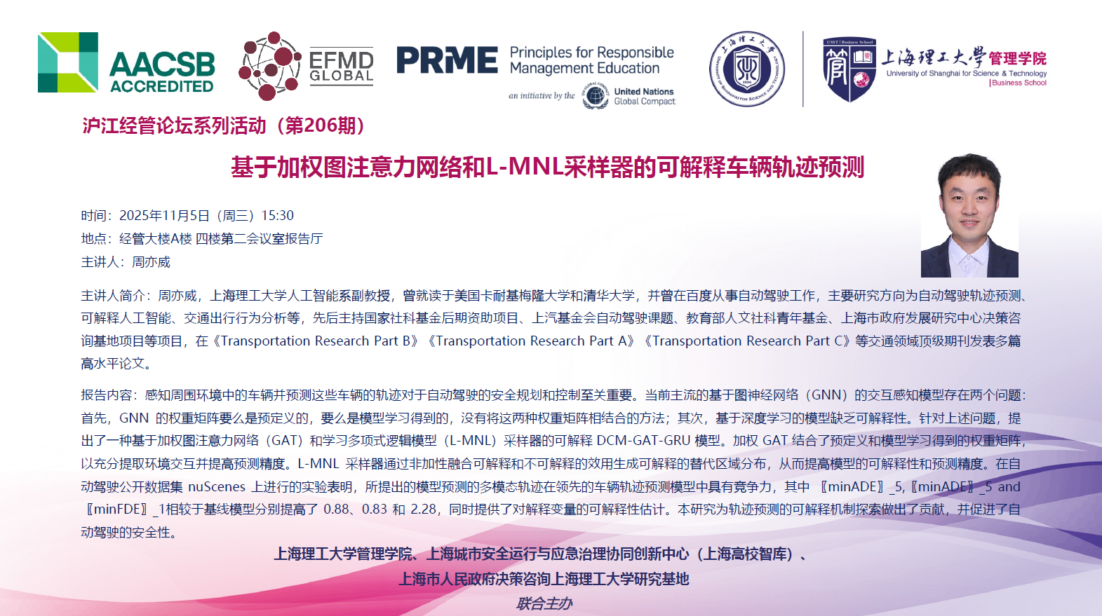 沪江经管论坛系列活动(第206期):基于加权图注意力网络和L-MNL采样器的可解释车辆轨迹预测