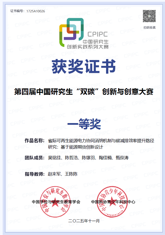 此次获奖成功实现我校在该赛事一等奖领域的突破,既是对我院研究生创新实践能力与科研综合素养的高度肯定,也彰显了学院紧扣国家“双碳”战略、深耕绿色低碳领域研究的阶段性成果。未来学院将持续以“双碳”战略为重点导向,进一步搭建优质科研实践平台,激励青年学子勇担时代重任,积极投身科技创新,为国家“双碳”目标的实现注入坚实力量。