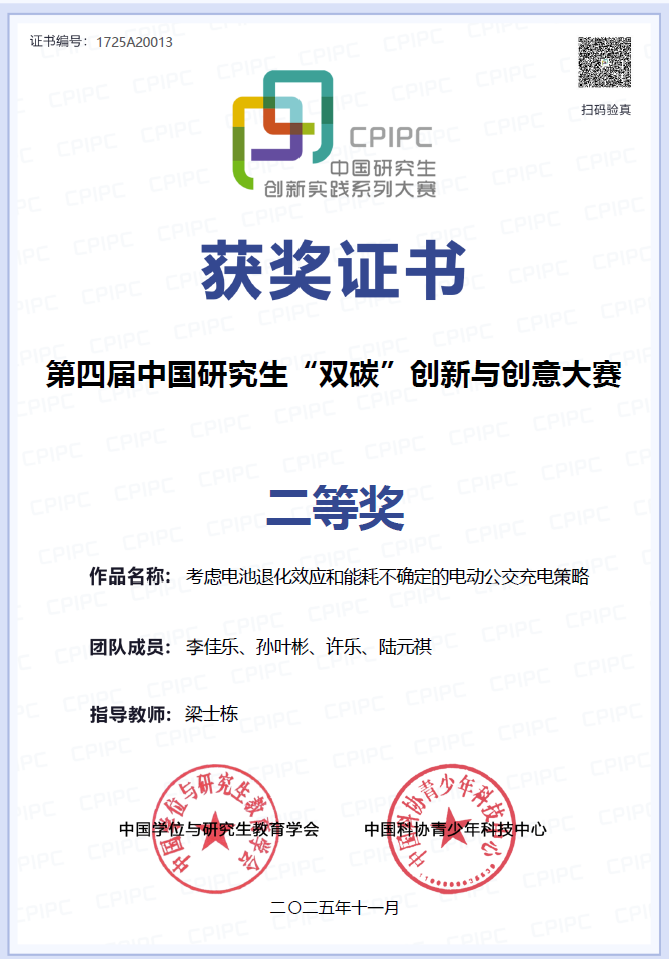 11月7日至9日,第四届中国研究生“双碳”创新与创意大赛决赛于沈阳化工大学落幕。经过激烈角逐,上海理工大学管理学院两个团队斩获佳绩,以2024级管理科学与工程硕士研究生吴铭佳为队长的“绿叶方舟队”凭借项目《省际可再生能源电力协同消纳机制与碳减排效率提升路径研究:基于能源期货创新设计》荣获全国一等奖,以2024级交通运输工程硕士研究生李佳乐为队长的“ToTo队”凭借项目《考虑电池退化效应和能耗不确定的电动公交充电策略》荣获全国二等奖。两队团队成员凭借新颖的研究视角与亮眼的展示表现,收获专家评委的一致认可,创下上理工在该赛事中的历史最佳成绩。一等奖团队指导教师赵来军、王陈陈获评优秀指导教师奖,上海理工大学亦斩获优秀组织奖。