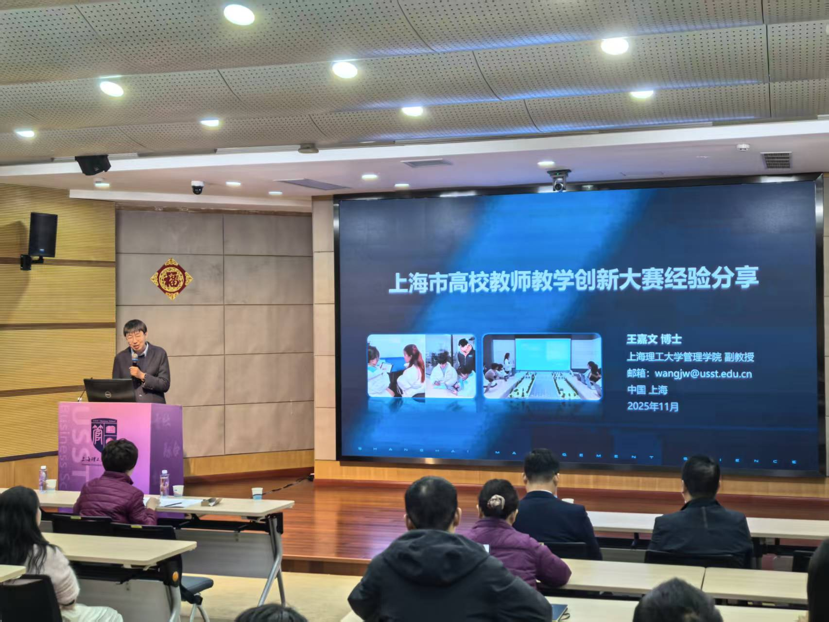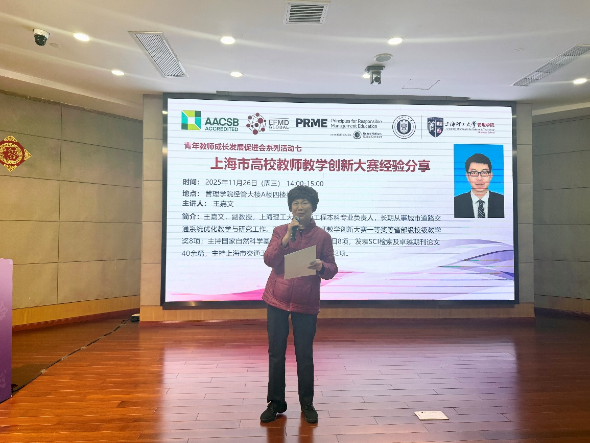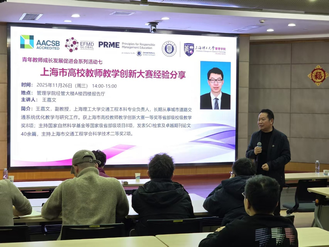 2025年11月26日,上海理工大学管理学院青年教师成长发展促进会2025年第七次活动在经管大楼A楼四楼报告厅举办。本次活动以“上海市高校教师教学创新大赛经验分享”为主题,旨在推广教学创新理念、分享实战经验,全面提升青年教师的教学创新能力和比赛竞争力。本次活动特邀交通工程本科专业负责人、交通系统工程系副系主任王嘉文担任主讲嘉宾,为全体青年教师分享其参加“上海市高校教师教学创新大赛”的宝贵经验。管理学院党委书记马静波、副院长房志明、青促会指导教师李正明以及学院青年教师参加了本次活动。讲座由工业与系统工程系青年教师吕可主持。