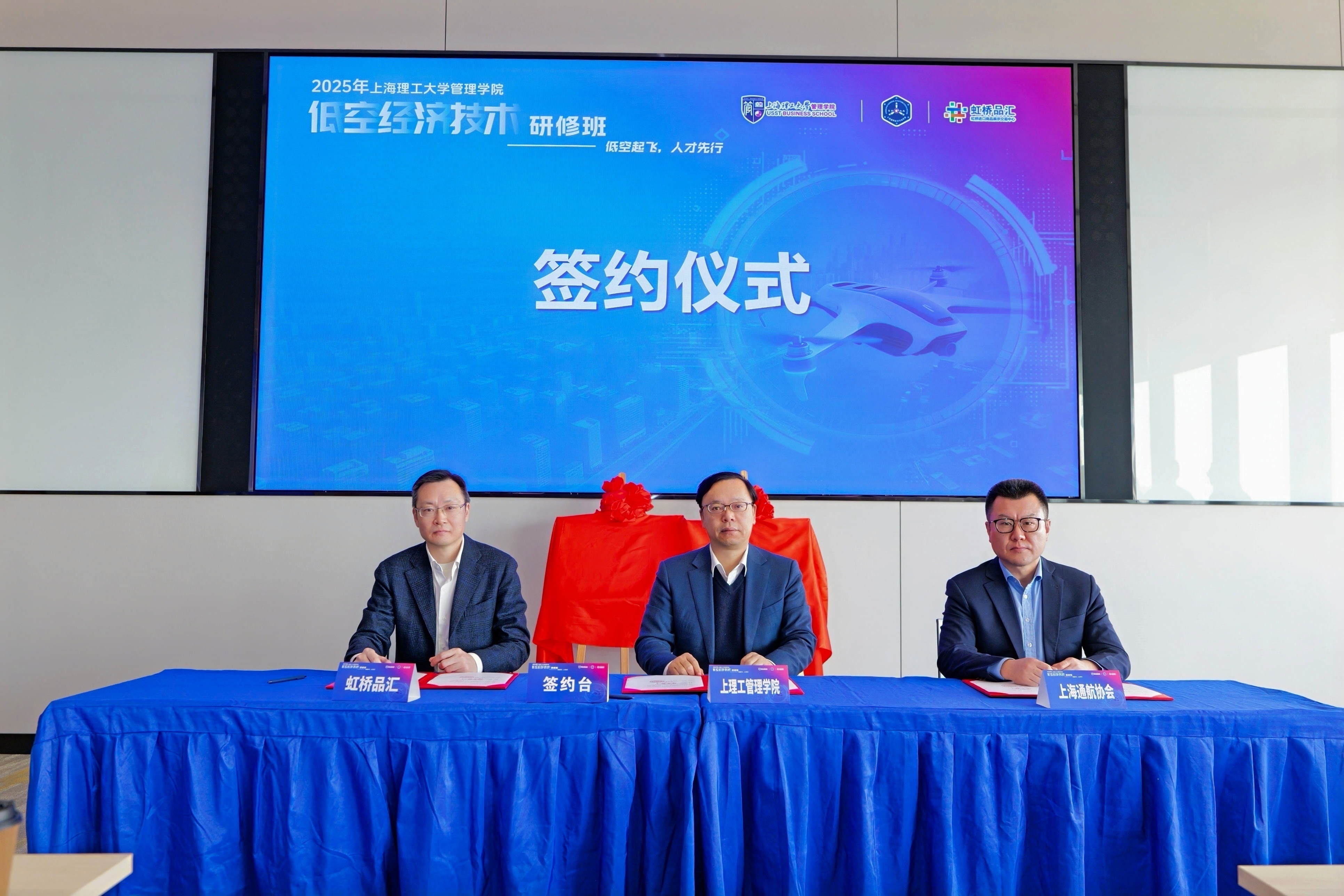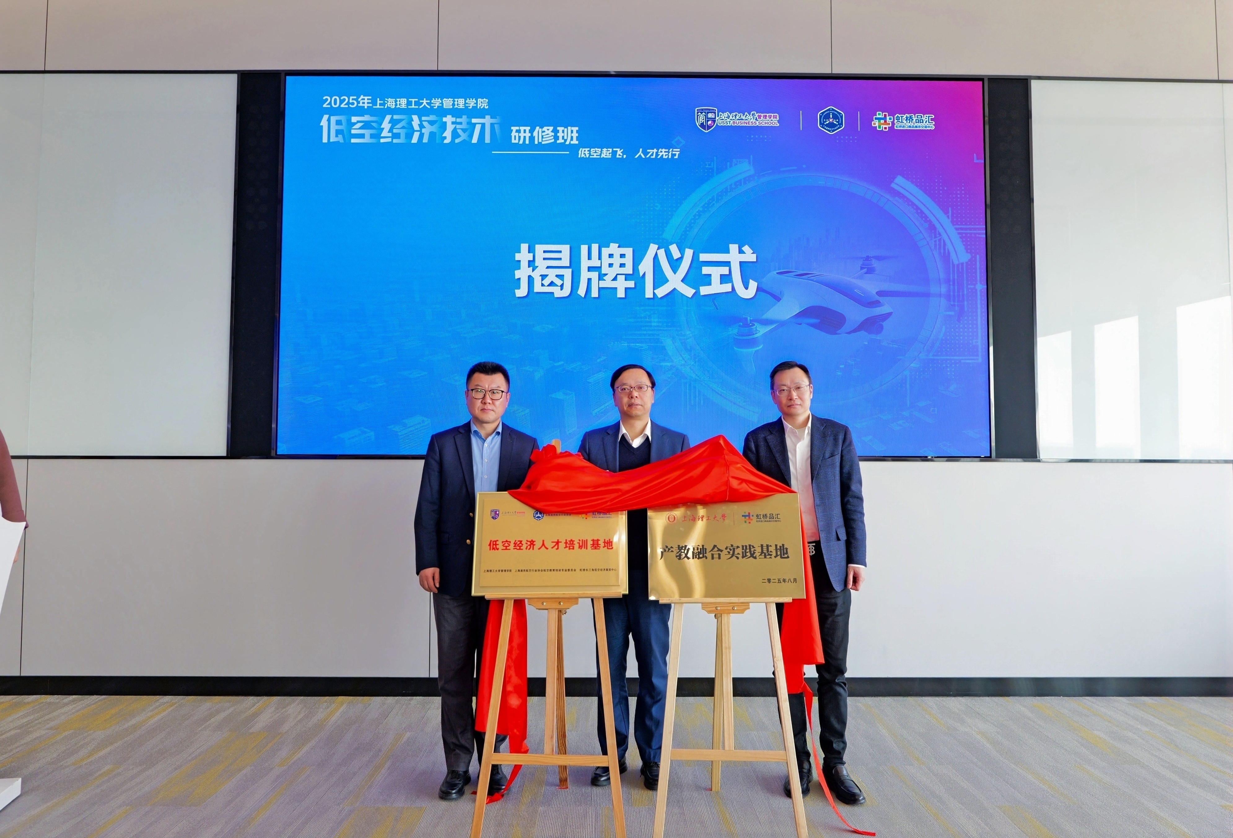 签约仪式上,管理学院院长赵来军、虹桥展贸中心总经理蔡军、上海通用航空行业协会教育培训专委会主任委员丁捷共同为“低空经济人才培训基地”和“产教融合实践基地”揭牌,标志着管理学院在低空经济领域的产教融合步入实质性推进阶段。
