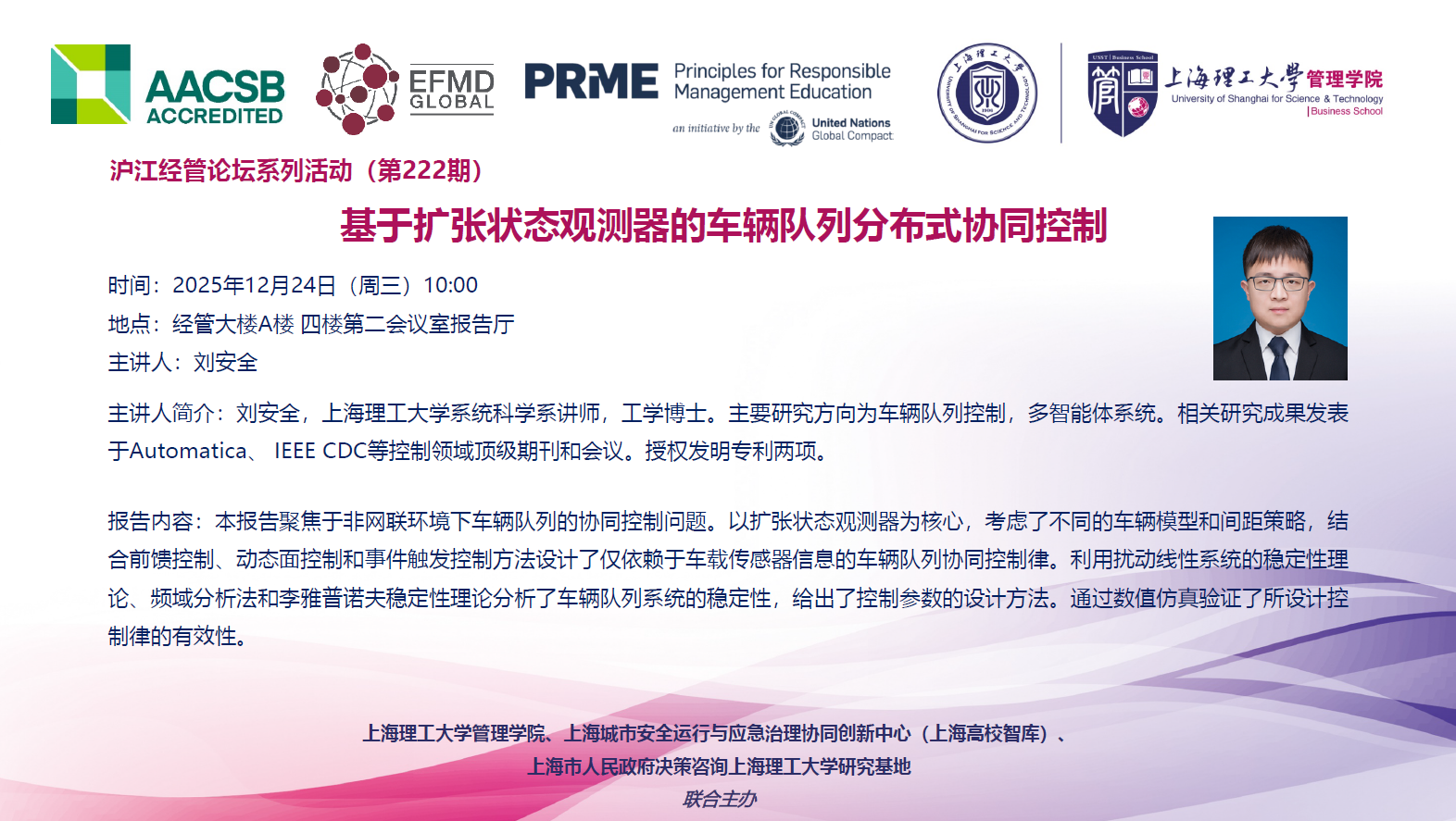 沪江经管论坛系列活动(第222期):基于扩张状态观测器的车辆队列分布式协同控制