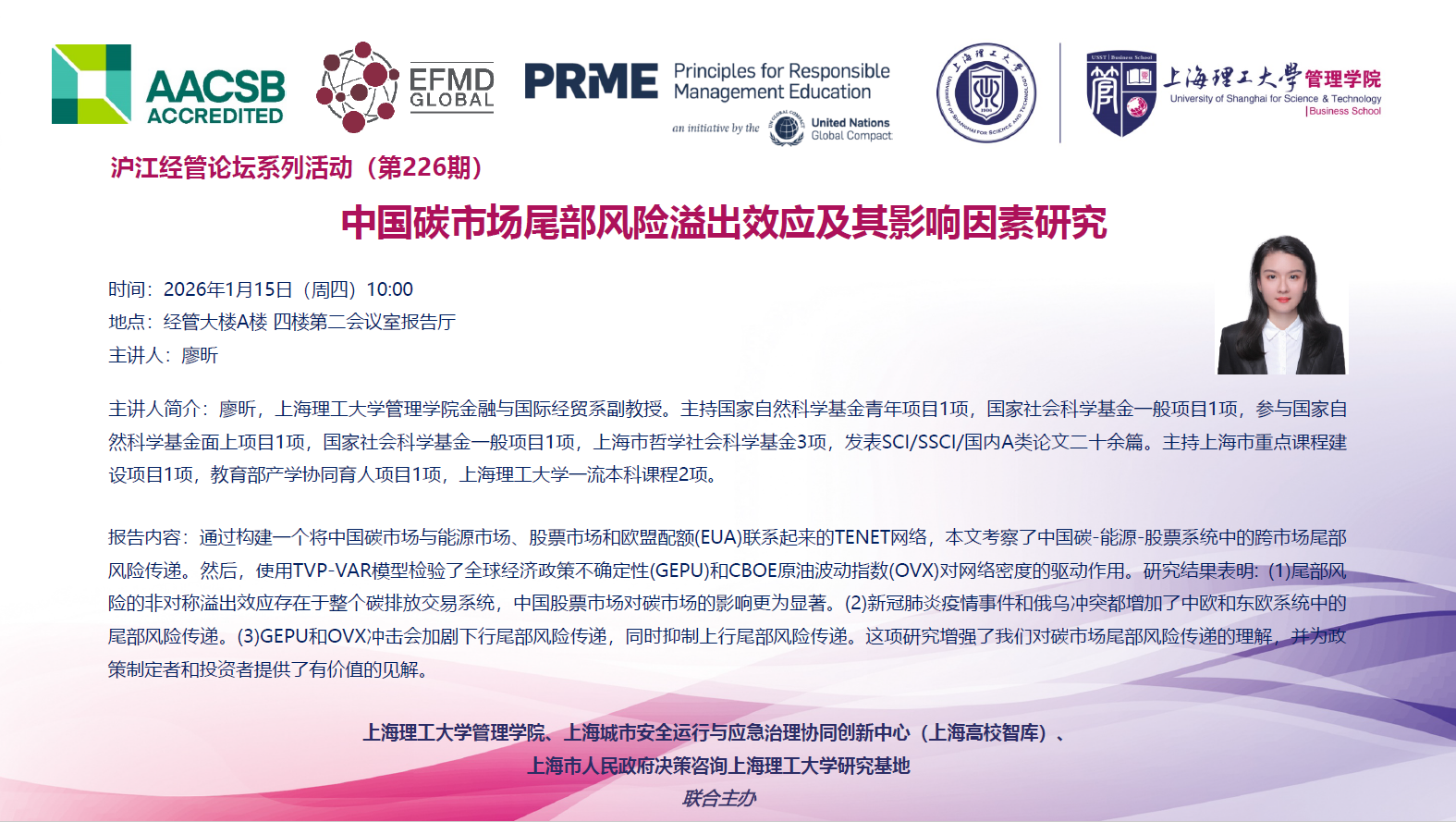 沪江经管论坛系列活动(第226期):中国碳市场尾部风险溢出效应及其影响因素研究