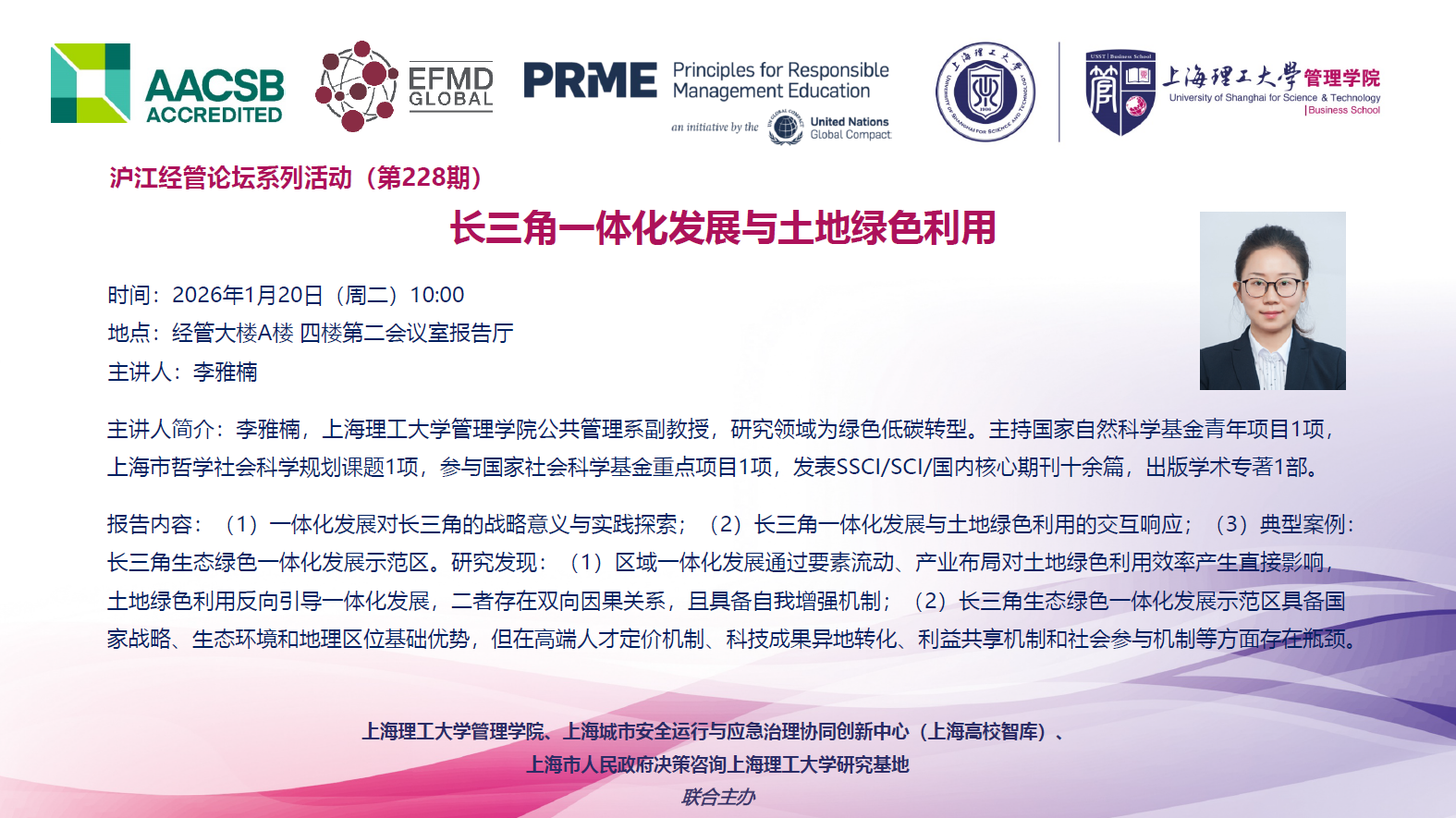 沪江经管论坛系列活动(第228期):长三角一体化发展与土地绿色利用
