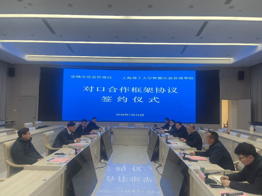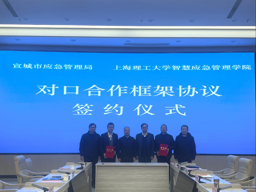 1月15日,上海理工大学智慧应急管理学院一行赴安徽省宣城市,与宣城市应急管理局签订对口合作框架协议。上海理工大学管理学院院长、智慧应急管理学院院长赵来军,管理学院副院长、智慧应急管理学院副院长房志明,管理学院副院长刘魏巍,宣城市应急管理局党委书记、局长周宁,副局长江政义等出席签约仪式。会议由周宁主持。