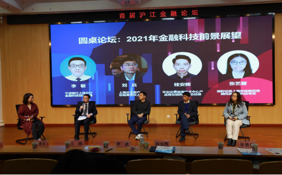 主题演讲后接着进行了圆桌论坛,宁波银行上海分行金融科技部总经理李敏、上海证大资产管理有限公司总裁兼合伙人刘兵、平安证券的桂安辉和湘财证券的张艺馨加入了讨论,四位嘉宾就“此次疫情期间,金融科技如何影响我们的生活,带来了哪些优势、哪些劣势”、“众多技术手段均被称为金融科技,如何去伪存真,评价金融科技的真实效用”、“有志于金融科技行业的同学需要提升哪些技能”等问题进行了热烈的交流讨论,现场氛围高潮迭起。